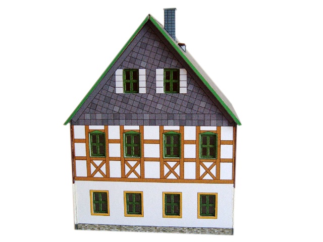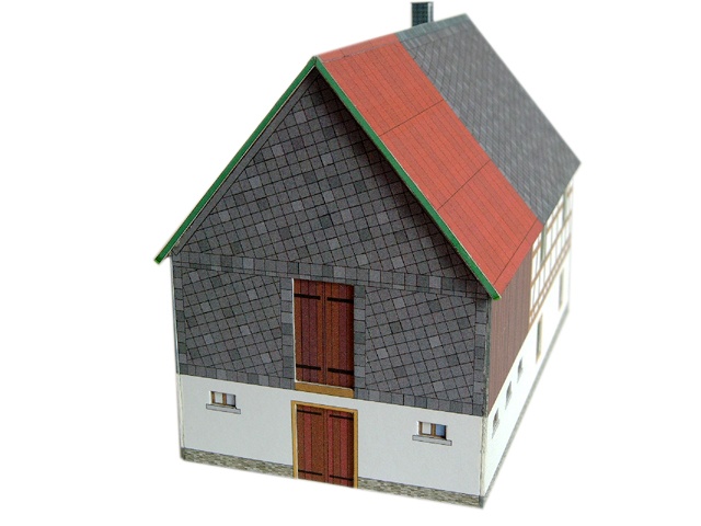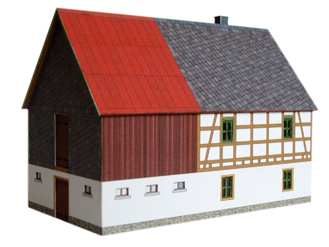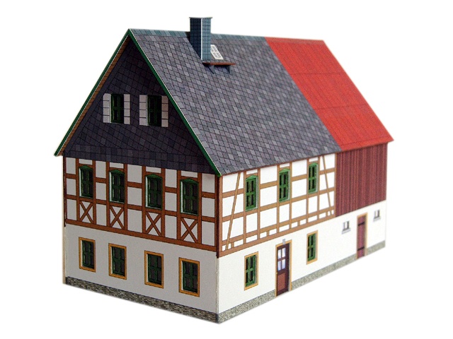 Modell eines kleinen erzgebirgischen Wohnhauses um 1800 aus dem Ort Steinbach, mit regional üblicher Schieferdeckung, Giebelverkleidung und sehr einfach gehaltenem Fachwerk im Obergeschoß. Typisches Häuslerhaus mit später angefügtem Anbau mit kleinem Stall und darüber liegenden Heuboden. Aus kostengründen wurde beim Dachdecken der Stallanbau oft mit Blech neu gedeckt und rot überstrichen.