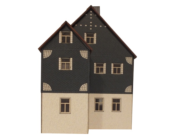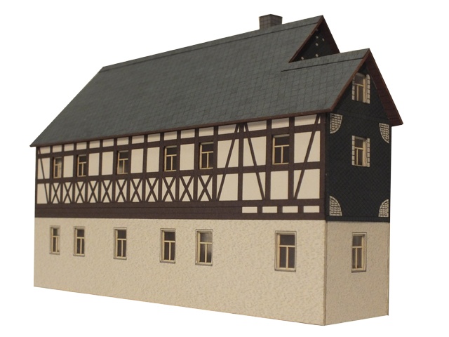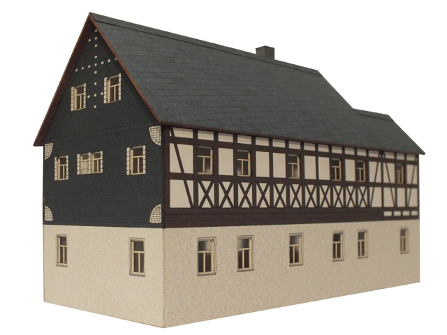 Erzgebirgisches Wohnhaus um 1800, mit regional üblicher Schieferdeckung. Das Fachwerk an den Giebeln ist mit Schiefer verkleidet und sehr dekorativ verziert. Die Wände zeigen typisch fränkisches Fachwerk mit Andreaskreuzen.