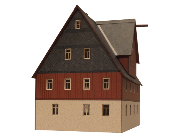 Erzgebirgisches Wohnhaus um 1800, mit regional üblicher Schieferdeckung. Das Fachwerk in den Obergeschossen ist mit Holz und Schiefer verkleidet. Die Gaube mit dem Kranbalken diente zur Einlagerung von Heu und Stroh im Dachboden.