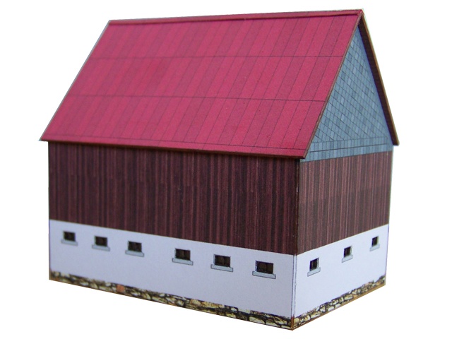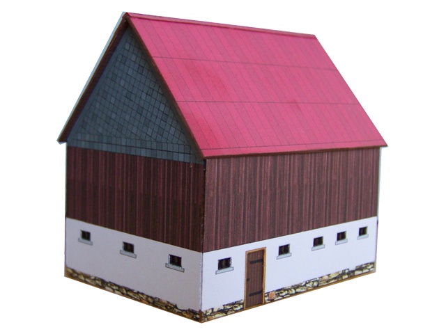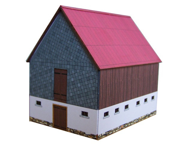 Modell eines typisch erzgebirgischen Stallgebäudes mit darüber liegendem Heuboden. Die Wetterseite ist traditionell mit Schiefer verkleidet. Das Dach wurde später aus kostengründen mit Blech neu gedeckt und meist überstrichen.