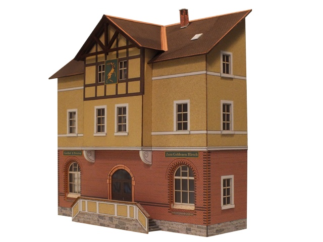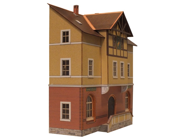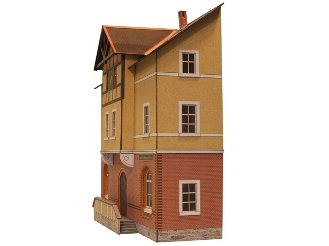 Gebäude-Bausatz Vorstadthaus mit Klinker, gelben Putz, Erker mit Fachwerk und Ziegeldach als Gasthof und Pension. Diese Bauart findet man in ganz Sachsen verbreitet in den unterschiedlichsten Variationen. Halbrelief eine Stadt auf wenig Platz.