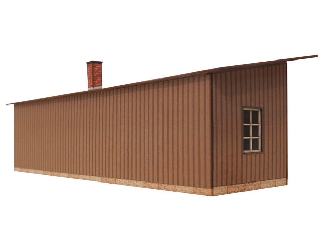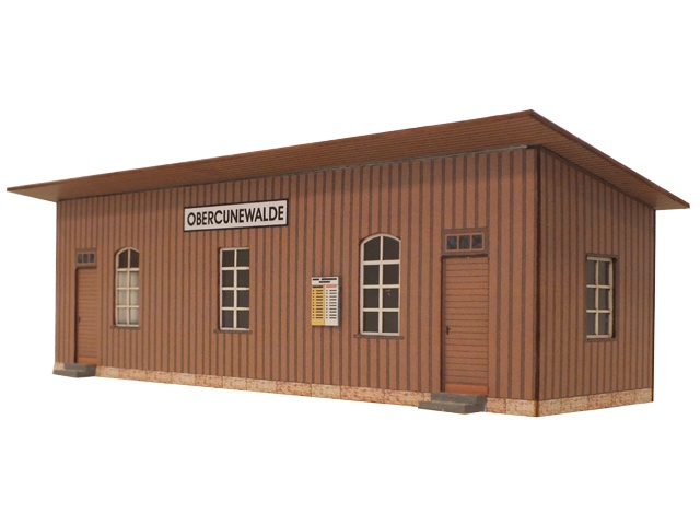Eine einfache, hölzerne Wartehalle beherbergt den Dienstraum und den Wartebereich. Diese Bauart findet man auf vielen Bahnstationen den Normalspurbahnen sowie Schmalspurbahnen.